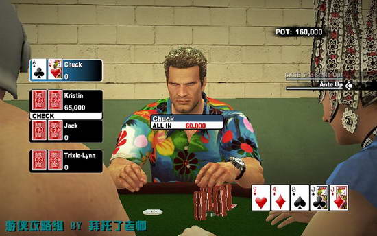 扑克的规则和简单,类似于梭哈,不过以手上的2张牌和台面上的5张牌加在一起计算。3个J,果断把钱全压上。对手没有赌资后会以身上的衣服、饰品等变卖补充金钱数,直至输到没东西可以当。每彻底赢光一个人的钱就会获得5000PP。