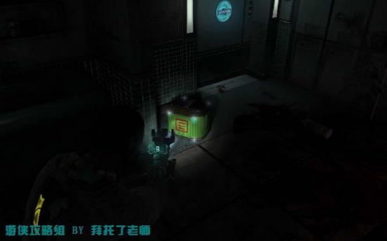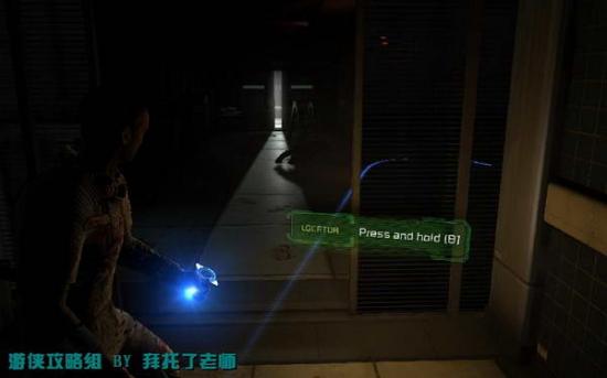 从电梯中出来进到一个比较黑暗的房间。从这里开始按B键可以获得前进方向的提示。在这个黑暗的房间中按鼠标右键利用武器的上的灯光来照亮前进的道路。