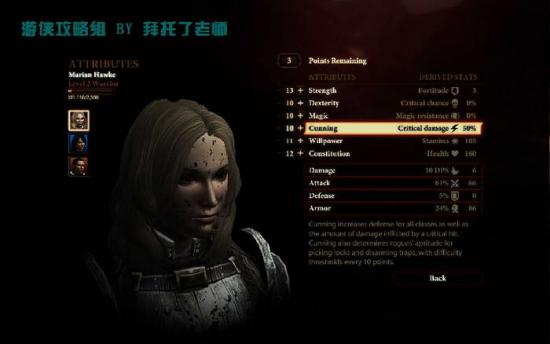 干掉敌人后获得经验,人物可以升级。每次升级都能获得属性点。Strength是提升毅力和近战攻击伤害的,Dexterity是提升爆击概率和远程攻击伤害的,Magic是提升魔法抗性和魔法攻击伤害的,Cunning是提升防御力和爆击伤害的,Willpower是提升魔法值或能量值上限的,Constitution是提升血量上限的。