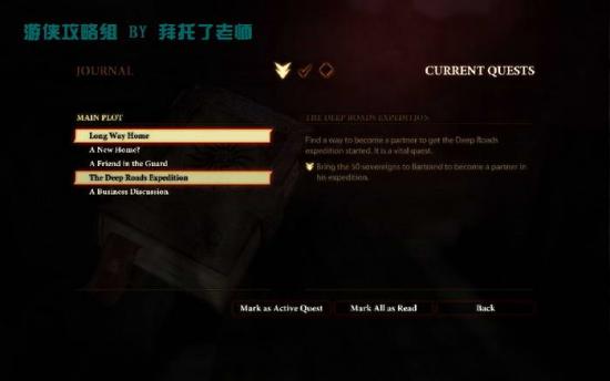 整顿完毕后出门,进入Lowtown,在下图位置找到The Hanged Man,进去后与Varric对话。任务A Business Discussion完成。The Deep Roads Expedition任务更新。