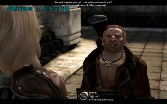 众人离开来到Kirkwall去寻找Gamlen。在对话后与前面的守卫对话然后就可以通过了。