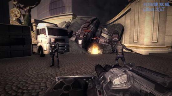 杀光所有外星人后和队友一起顺着马路前进,把剩下的外星人肃清之后到图中这里, 等队友向飞机那里扔两颗手雷炸开条路后进去上过街天桥。