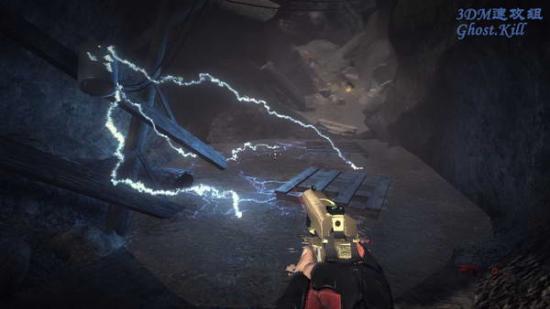 从管道出来后顺着废墟走,有电流的地方才在木板上跳过去就可以,着火的地方点着一个尸体, 尸体上绑着一个灭火器,打爆灭火器灭火后进入管道。