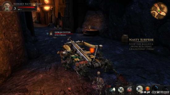 一段动画后关卡终于来了。N多小怪护送这一辆弩车,你的任务就是在弩车到达大门前把推车的几个小怪杀了。我打的时候是先跑到弩车后面的两个小怪中间,