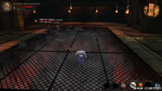 【主线任务14 鲜肉】纳宁···斗兽场。地上有武器(紫色的!)你可以捡起来,加血和红瓶还可以用。你的任务是打败他们的同时保护狱友。