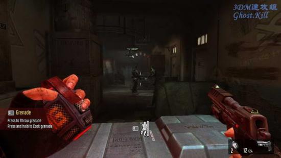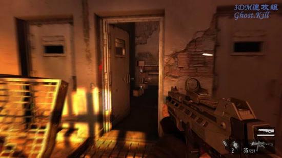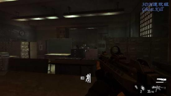 从控制室出去后再干掉两个敌人后上楼,楼梯上可以补充下子弹和手雷,到二楼开门进屋, 这里两个聊天的敌人用手雷干掉,按G扔出去,按住G会有爆炸倒计时,很快。