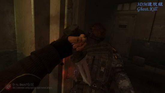 CG结束之后按住E打开房门出去,在警卫背后按鼠标中键用刀子干掉,升级后可以飞踢和滑铲。