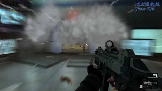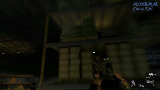 上一关最后抢来的直升机坠落在一个超市中,穿过一些架子之后来到一个满是电视屏幕的房间, 周围黑乎乎的,到了这被围起来的地方后捡枪干掉冲进来的敌人。