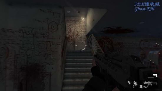 开始之后两个敌人可以背后暗杀,干掉街道上剩下几个敌人进入一个民房的车库, 进入大楼里,周围墙上都是一些符号什么的,看着挺恐怖,不过没有怪。