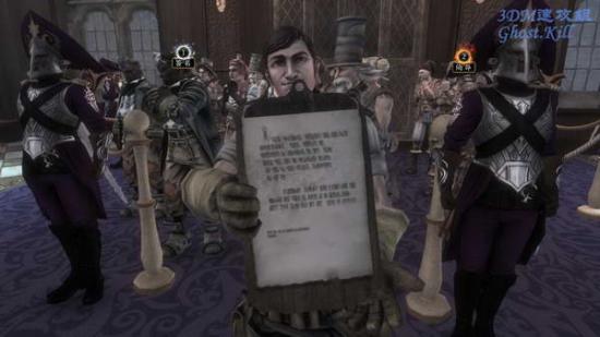 到石像处等着沃尔特触发机关,然后拿起石像手里的公会徽章。