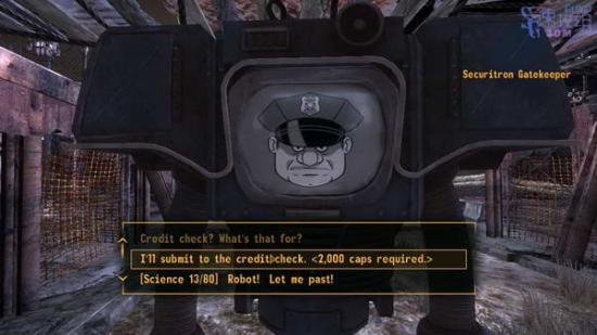 远远地就能看到维加斯的灯光了,通过一开始的大门之后的街道,有人向我们攻击,虽然不知道是干嘛的但还是干掉他们吧,似乎是强盗。再接着过几扇门来到图中这个机器人这里,想要继续前进的话就交钱吧,两千块,还真黑,无奈之下只能掏钱了,然后通过。