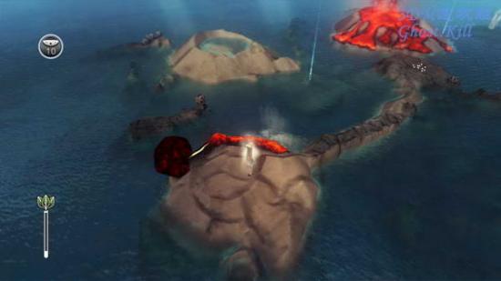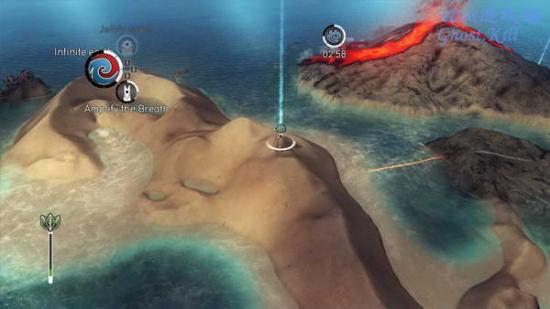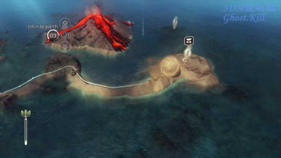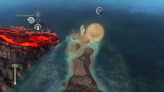 开始之后在一个小岛上,周围没有可以走的路,先把镜头向下移,可以看到无限土地的那个图腾, 第一个目标就是它,利用火山口的土和岩浆铺出一条路来,还要把图腾周围改造下才行。