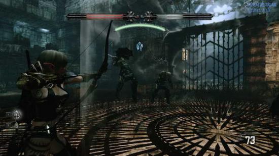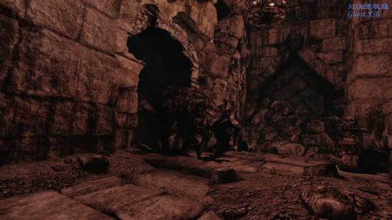 这个两侧全是牢房的房间,干掉所有敌人之后退墙上的推杆可以把牢房里的平民放出来, 右侧的一个牢房里有个紫色棱柱体,打烂之后可以得到一把带魔法伤害,攻击力可观的弓箭。