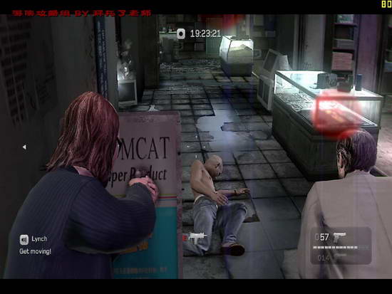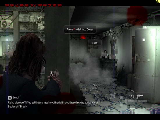 Lynch与Kane开始追击。一路尾随着Brady,不要靠太近,不然会遭到射击。上楼进入一条走廊,小喽喽就会开始出现,注意按C键借助障碍物进行躲避,右键瞄准目标,左键射击。枪的子弹不多,所起要捡取尸体上的枪支或弹药。