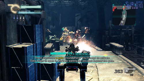 这一小节一开始在桥下激活数据点,干掉桥那里的敌人后前进来到这图中位置,这里可以看到一栋楼,一路杀到这栋楼的楼顶,最顶层房间里有机体,可以用来对付敌人防御炮和机体,都干掉之后操作大门处的电源,开启大门。