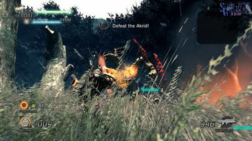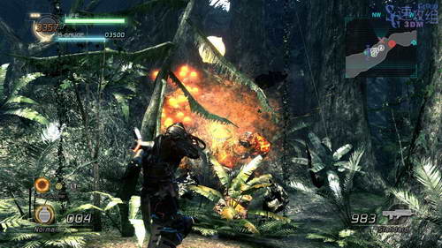 动画结束后先激活数据点,然后前进,这里的树林只有一条直直向前的路,植物很多很碍眼,按住B可以冲刺,路上时不时的两边会钻出来怪的巢穴,全部干掉后到达前边队友直升机的那里。