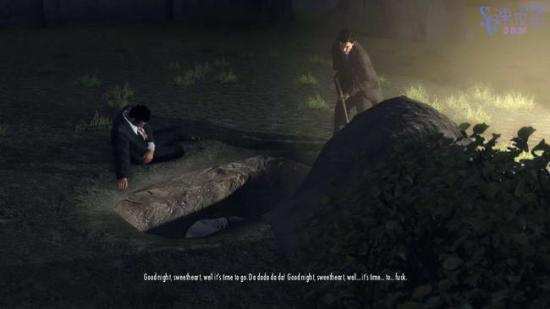 到达指定地点后Joe吐在了车里,俩人都醉的精神不稳定了,后备箱里的尸体都臭了,好一个欢迎仪式,刚出狱就要来替他们埋尸体。埋尸体也就罢了,还要听大叔唱歌,请自备狗耳。