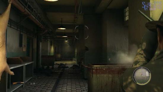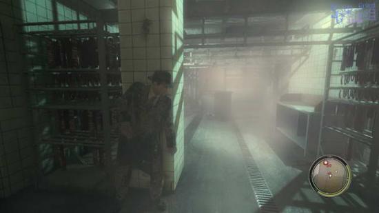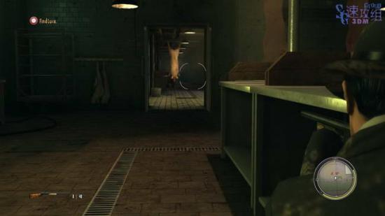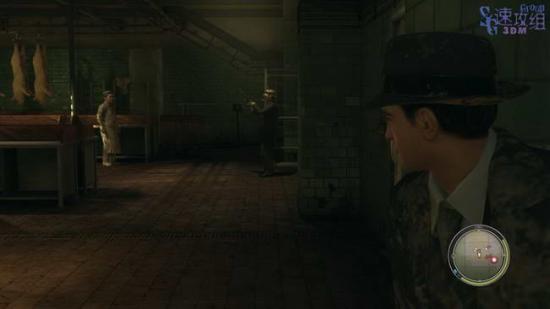 接下来满是猪肉的房间,从桌子后边绕过去,到图中的位置,拿着枪的家伙会把两个工人带走。
