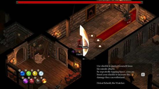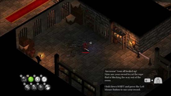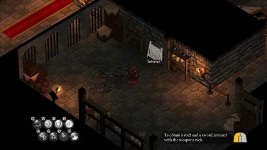 走出刚开始的场景来到学员上部,剧情发生,主角掉落到地下层。首先你要点击左边的武器架拿去近战武器。近战武器的使用办法是没有按魔法的情况下,LSHIFT+鼠标左键