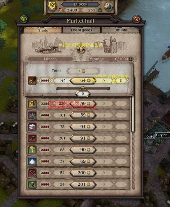 这里要注意的是每个货物的旁边的红色,绿色标签。如果某个物品为4个红色格子则说明这个物品在此城镇非常短缺,如果你出售此类货物会大幅度提升你的支持度