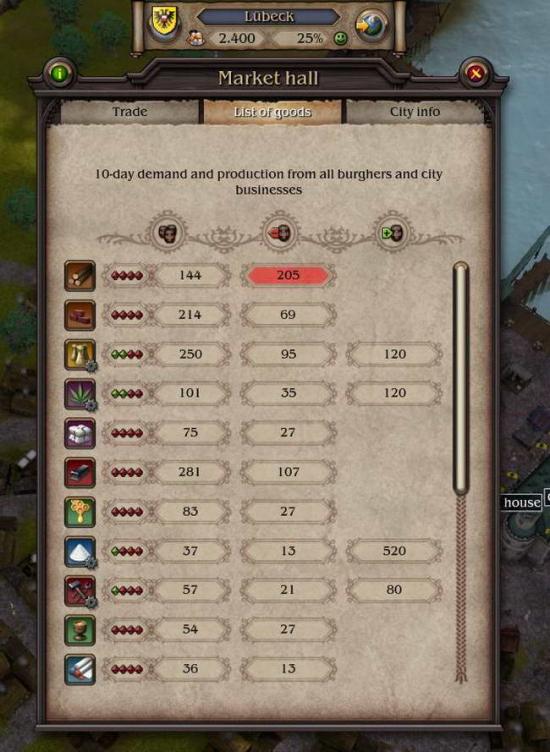 LIST OF GOODS则是给你一个详细的未来10天的市场货物的变化。譬如食盐则是未来10天会消耗13,但是城镇会生产520。而譬如有些物品在未来10天需求量远大于现在的市场量,那么其右边的消耗数则会显示为红色。譬如下图