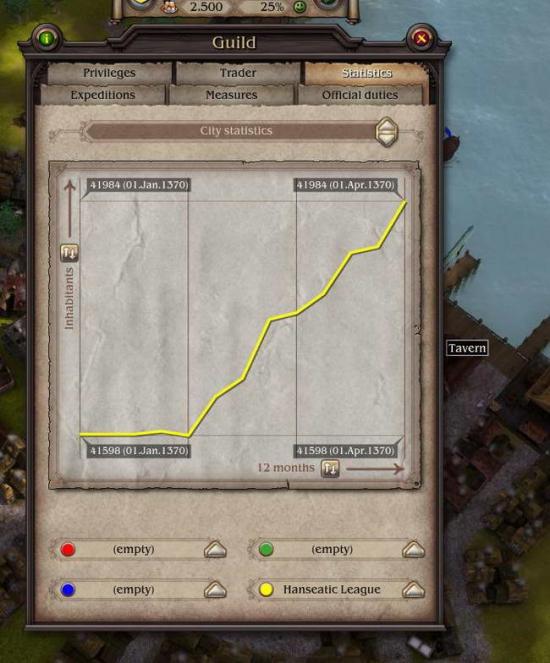 STATISTICS.在这里你可以通过折线图,看到整个汉撒同盟和你所在城市的各类状态。下面的红色,绿色,蓝色你可以点击进行城市的选择进行对比