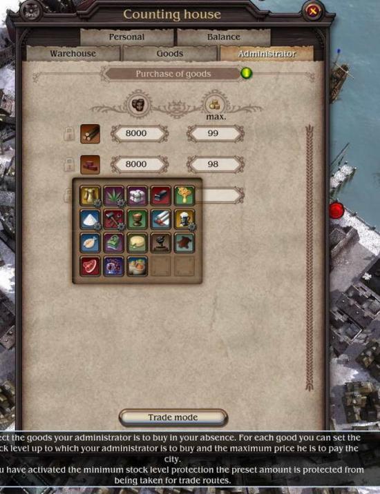ADMINISTRATOR。这里你可以雇佣一名管理者来代替你对于市场的指定货物进行收购。佣金是每天50金币。这里建议一定要雇佣。因为前期有很多的资源都是紧缺的,譬如木材,砖块。而从建造建筑物到生产船只都需要大量的资