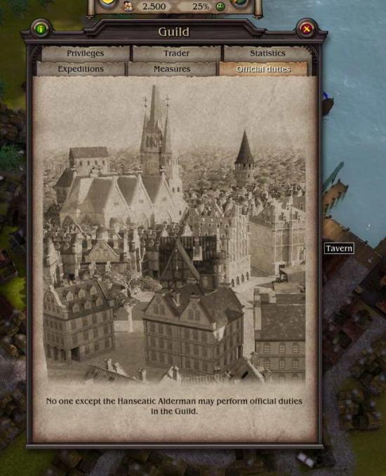 TRADER,在这里你可以看到你在汉撒同盟内与其他AI的势力概况,以百分比来表示。这里没什么要注意的,你倒是可以看一下汉撒同盟的主席选举的时间