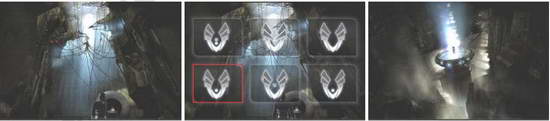 继续向前赶路,前面有一束光线从空中洒下来,那里有个设备,我把假眼睛(Eye implant)放上去,设备折射出一道光线。右转后走过一段管道,看到一个空中13号堡垒。在绳子上挂上反物质板(Transport fram),组合开瓶器和座椅,再把座椅挂上去,就可以降落了。落地后进入控制室,左边墙上画骷髅的位置可以拿到一张红色的卡。再坐缆车回去,直到先前放入我自己通行证的那个机关,把两张卡都插进去。再拉动机关就可以看到电力回复了。再回到控制室,拿起通讯器,再按下控制台上的按钮,看到一段影像。走出控制室,调节那个球形发光装置下的手柄2次。再进控制室,就可以从左边的门出去了。