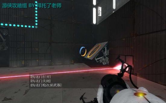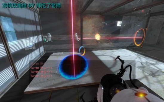 进入下一个房间后,先跳过炮台发射的光束。站到红色按钮上开启激光,然后在激光打到的地面开个蓝色传送门,再在右前方的墙壁上开个黄色传送门,使激光射到那些炮台来摧毁它们。