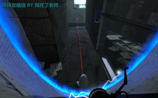 进入下一个房间,在光束带打到的白墙上开个蓝色传送门。