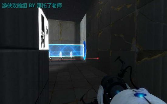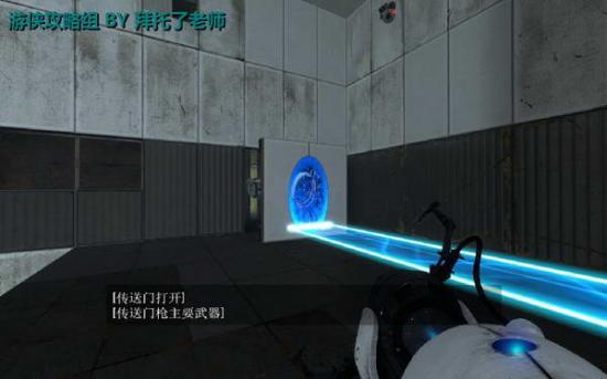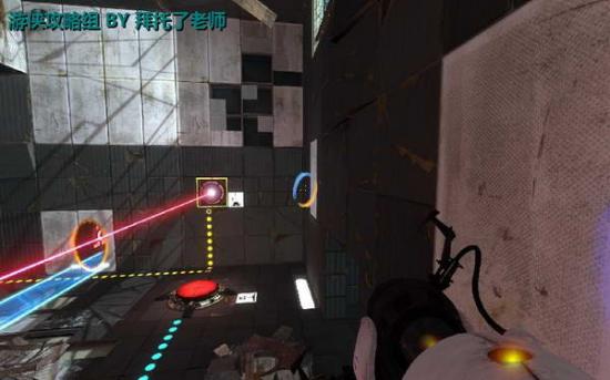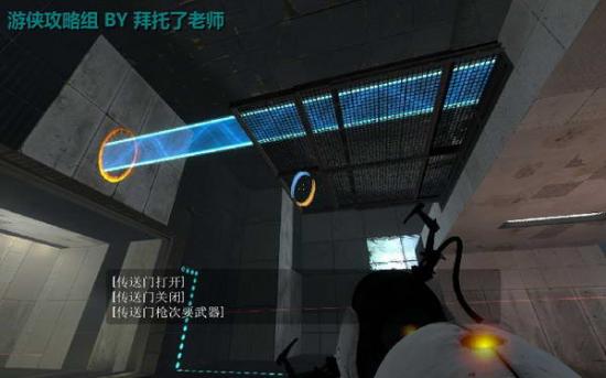 进到下一个房间等待GLaDOS开启大门。进去后先在边上开个蓝色传送门,再在光束带上面的白墙上开个黄色缠传送门。这样就可以到光束带上了。