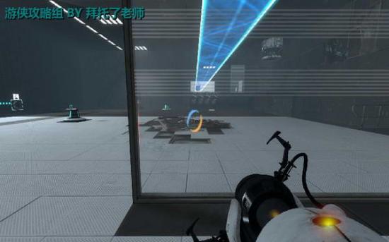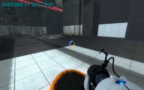 进入下一个房间,先在光束带打到的白墙上开个蓝色传送门。