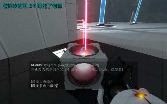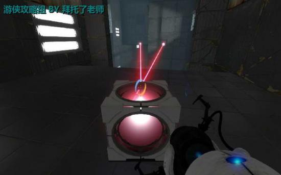 进入下一个房间,在左边三个接收器那里的白墙上开个传送门,然后在下图位置开个传送门,并移动好箱子,使三束激光分别射到三个接收器上。