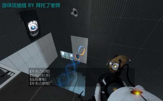 继续前进,在第二个房间里面,按开关放下箱子打开大门,然后开传送门过去。这个房间还要重复测试一次。