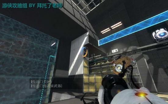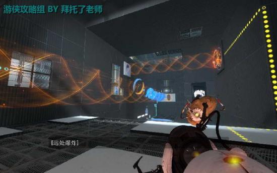 随后在传送波那里开蓝色传送门,地面开黄色传送门,到达空中时在斜面开蓝色传送门,这样人物就会从斜面飞出,落到刚才喷了弹跳凝胶的地方再次飞跃,抵达大门那里。一路前行再次遇到了Wheatley,第八章结束。