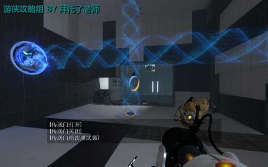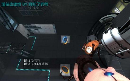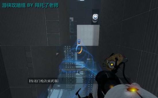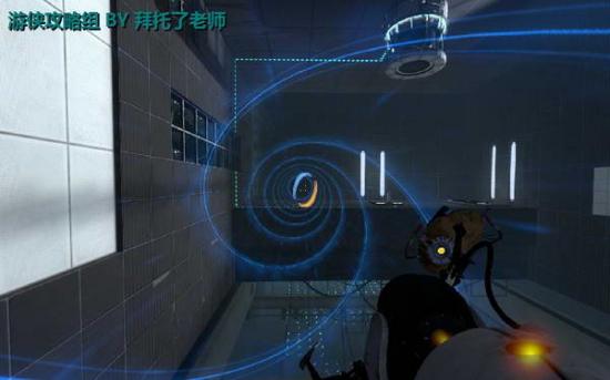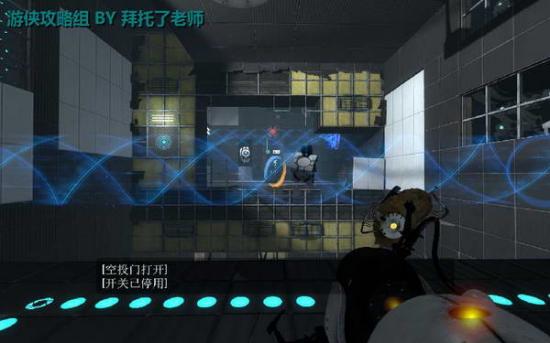 进入下一个房间,在传送波的白墙上开蓝色传送门,在左边的白墙上开黄色传送门,这样就可以到达对面的平台了。