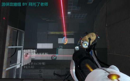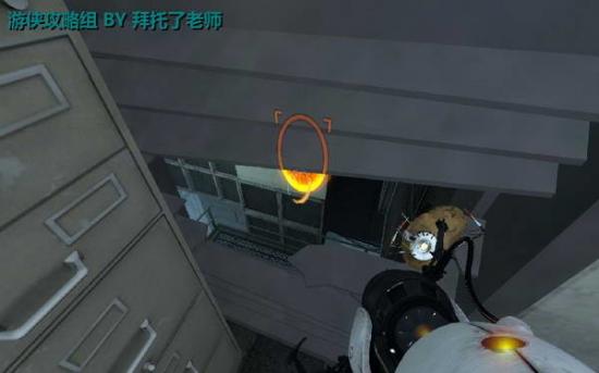 当弹跳凝胶就要抵达传送波发射器时在右边的白墙上开传送门,同时从按钮上下来。当凝胶到达下图位置时,断掉传送波,使凝胶下落摧毁炮台。