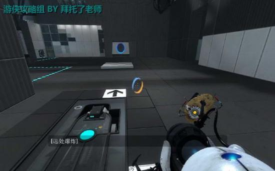 开始第八章后,进入房间在右边破碎大门的后面开传送门过去。之后坐电梯来到第一个测试房间。把一个方块机器人放在红色按钮上,大门就打开了。