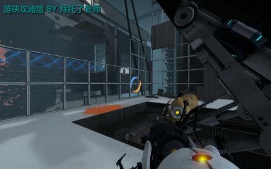 进入下一个房间,开传送门,引导传送波把左边的炮塔推下去。然后开传送门使蓝色传送波接触到箱子。