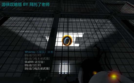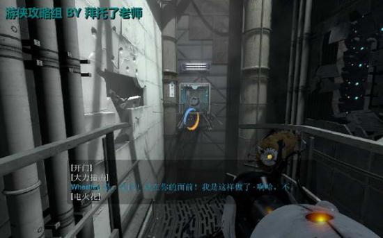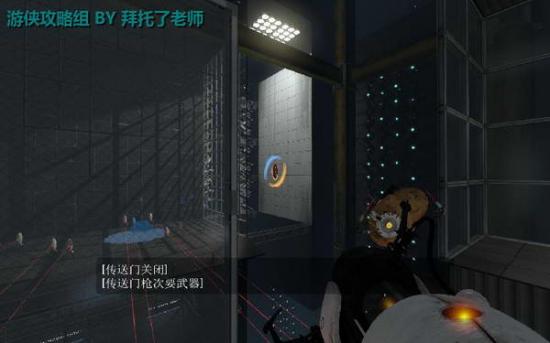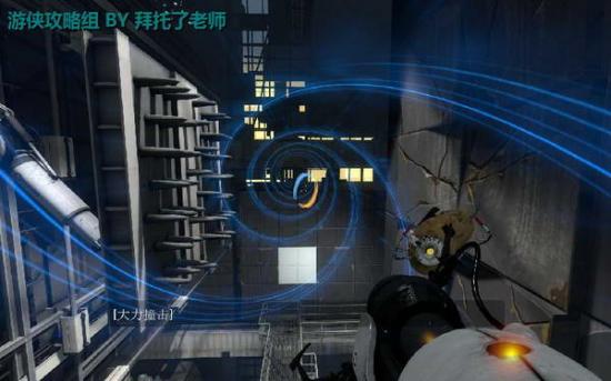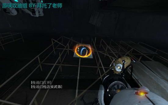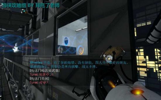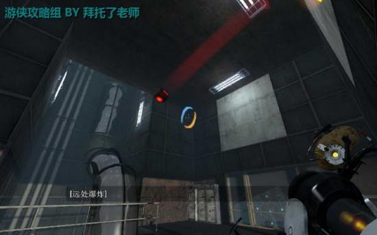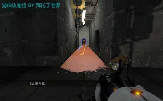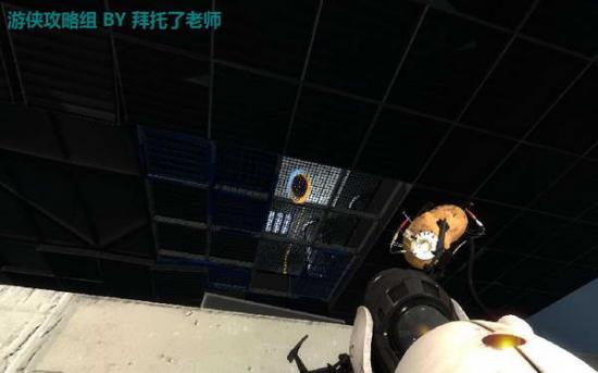 上去后先在蓝色凝胶喷射点开蓝色传送门,然后在炮台右边的白墙上开黄色传送门,是蓝色凝胶喷到那些炮台来摧毁它们。这里主角需要站到红色按钮上蓝色凝胶才会喷出。随后使用弹射器到达对面。