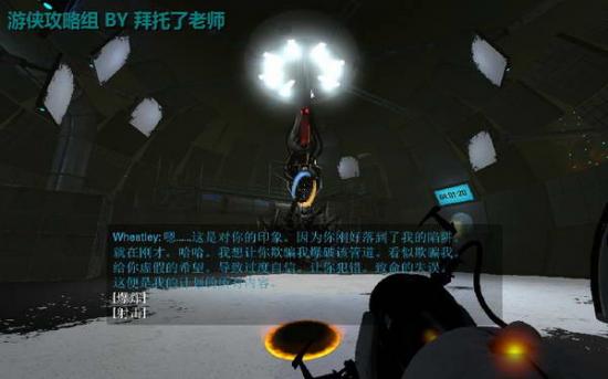 在前面把GLaDOS插入装置中,然后坐电梯遇到了Wheatley,在这里会展开一场BOSS战,Wheatley的每个阶段都会有时间限制。先躲到白色管道后面,诱使BOSS放出炸掉炸掉管道,释放出白色凝胶。