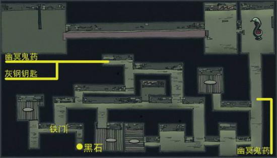 游戏制作者痛恨该类地牢型迷宫,但是为了虐其他玩家泄愤,小小弄了一个……调查入口处的蛇像,发现需要“蛇心”“蛇胆”“蛇牙”“蛇信”四部分来开启其左侧铁门,逛遍迷宫在四个小型蛇像处获得此四样道具。迷宫中有大量隐藏物品,可获得“十个幽冥鬼药”等道具,最重要的一个隐藏物品是“灰钢钥匙”,用它可开启地图左下方的门,得到游戏中第三枚“黑石”。此外该地图中尽量收集“悲鸣药”,将“鬼步”和“瞬杀”升级。