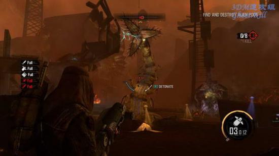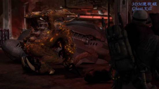 上来之后遇到了本作最强的怪,血超厚,攻击力超强,近战远程都可以,背上的两个爪子可以远程攻击, 发射出来的东西可以释放毒气范围攻击,中近距离还可以冲撞,和他打很耗子弹,冲击波也不能把他震倒。