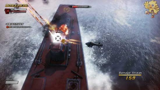 换成直升机后,我们沿着红色箭头向前,看见一艘航母...挨个的打掉航母上的炮塔, 躲避着打,要小心敌方直升机,打完后会去打boss,在航母的前方,这时候要周旋的打, 小心他的跟踪导弹,他的炮会夹击过来.