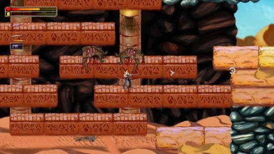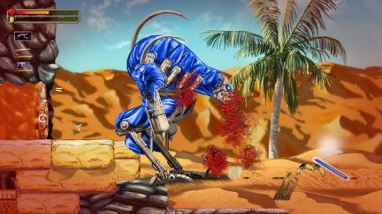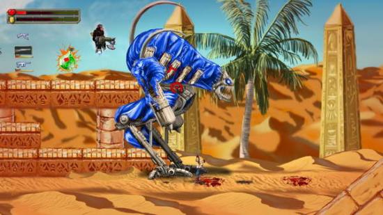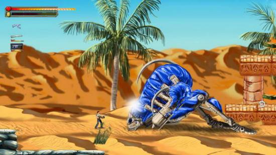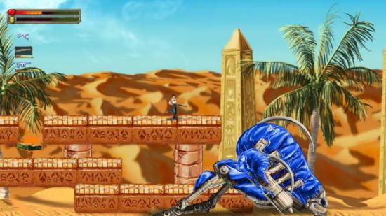 别以为渡过了这个山洞就离通关不远了,当初我就是这要么以为的,结果高兴过早了。。之后才遭遇了真正的BOSS,如图,就是那个蓝色机甲怪兽