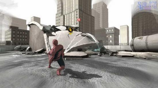来到楼顶后按十字键上键找到碎片位置,不过被废墟挡住了,按B用蛛丝抓住石块吗,连续按B破坏石块,得到碎片。