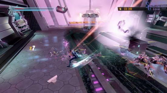 干掉全部怪物,体型大点的会瞬移,等他瞬移后回到空中浮着的平台上狙击我们,看到有激光向这里瞄准的话就子弹时间, 切换视觉模式找到他把他踹下去。小怪都可以一下秒杀,不过他们会自爆,要小心。
