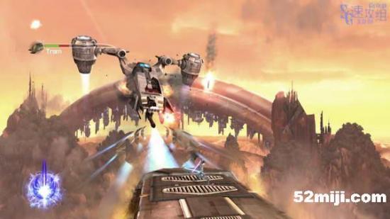 最后的桥上还是要冲刺逃命,然后逃到飞船上,接下来我们站在飞船上,要打下来迎面杀过来的一架又一架的飞船,很简单,只要对着他们按一下RT他们就会瞬间失去平衡然后坠落,虽然一次只能攻击一架,不过可以利用攻击的那一架撞烂其他的,左右两边都有,防守一会之后敌人大号的飞船飞过来。