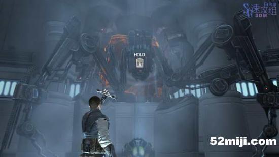 从电梯出来后按住RT加方向键打开门,第二扇门进去后会被机械蜘蛛攻击,干掉第一批之后会被成群的蜘蛛围住,按住LT加B攻击范围攻击,接着蜘蛛还是一批接着一批的出,跳起来LT加B蓄力攻击比较好,杀光所有后把电池装到门上,通电后进门。